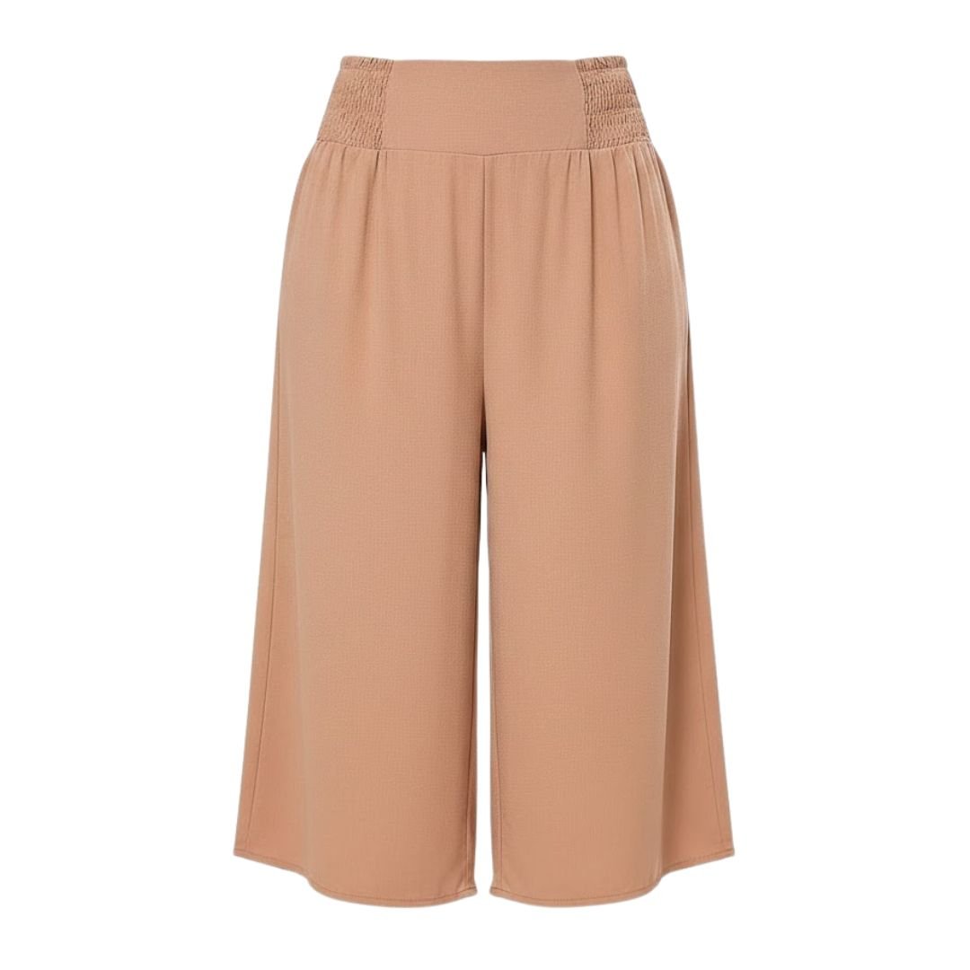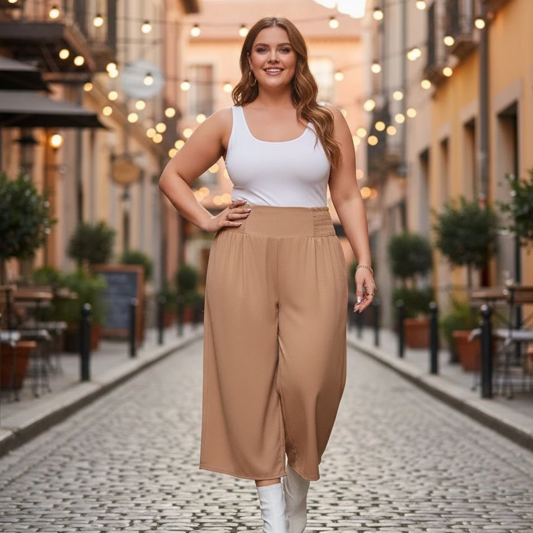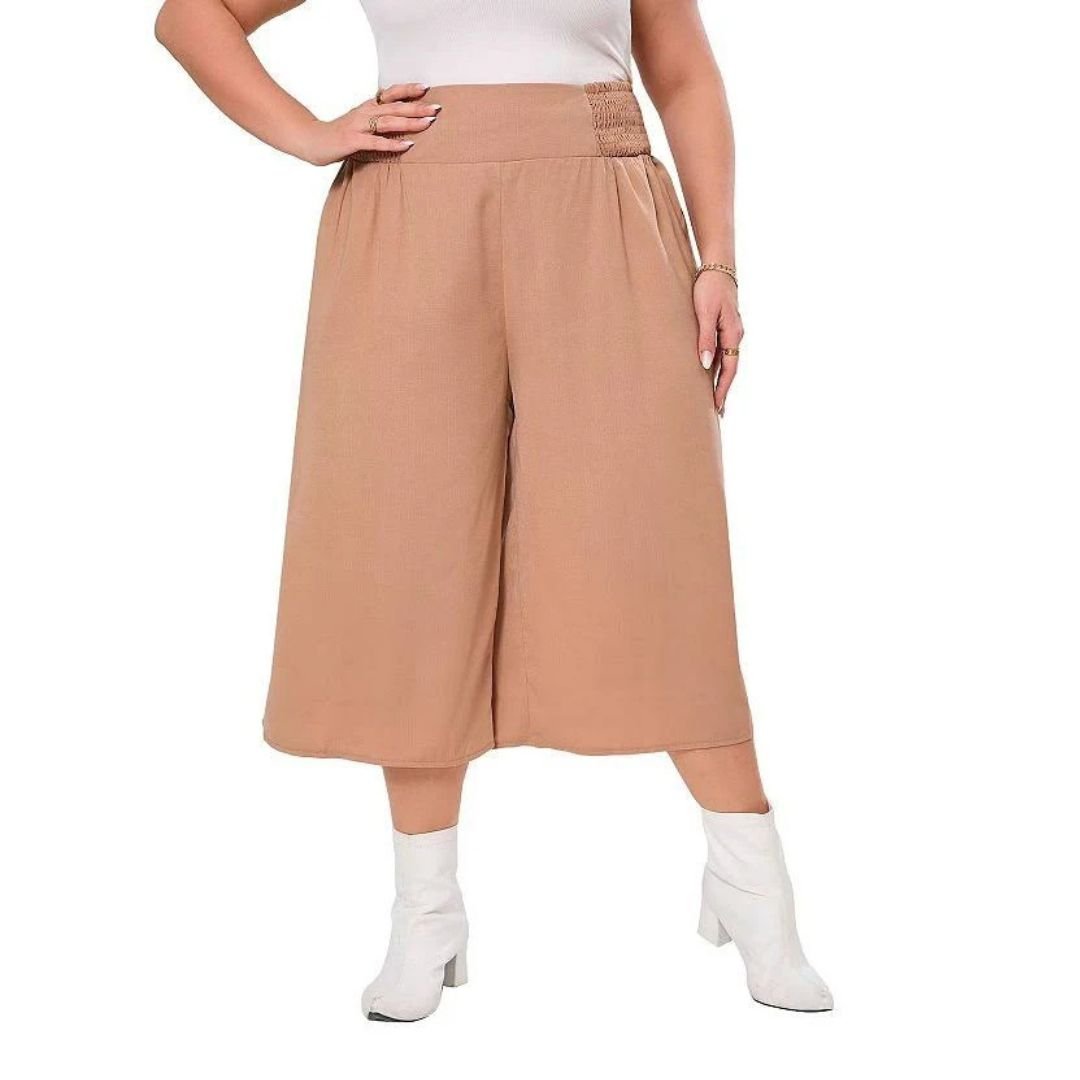 Technical Specifications Material: Soft woven fabric blend. Fit: Plus size loose fit. Waist Style: Elastic waistband. Leg Style: Wide leg, open bottom. Pockets: Functional side pockets. Size: 3XL. Color: Khaki. Care Instructions: Machine washable, gentle cycle recommended.